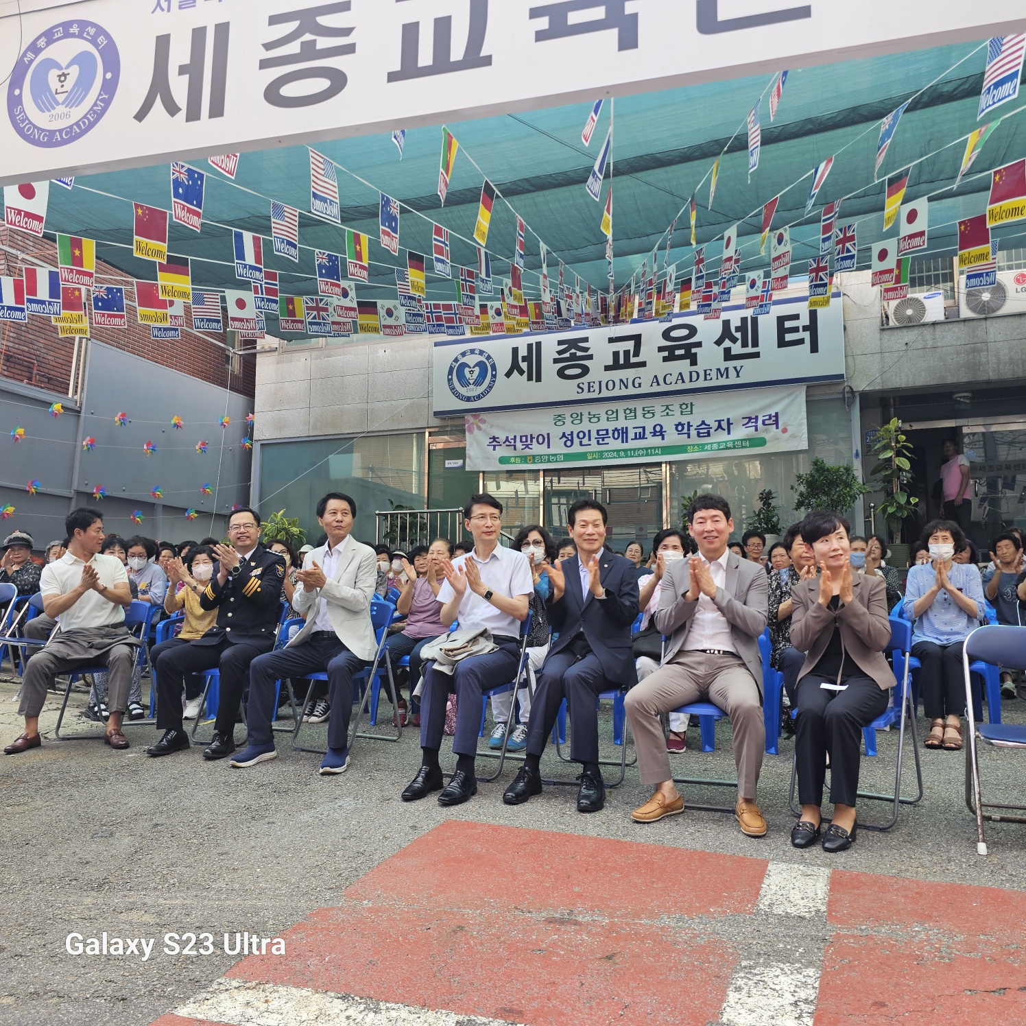 중앙농협 24년도 추석맞이 문해학습자 격려 0 일 시 : 2024년 9월 11일 11시 0 참 석 : 광진, 갑 을 국회의원, 광진경찰서장, 광진구의회 의원 5명, 광진구 문화원장, 광진구복지재단이사장 등 120여명 0 격려내용 : 쌀 4kg들이 1포씩 지급 0 기타행사 : 전국성인문해교육 시화전 수상자 시 낭송 - 시 낭송자 : 이상례 (부총리겸 교육부장관상 수상) 이상순(서울시장상 수상)